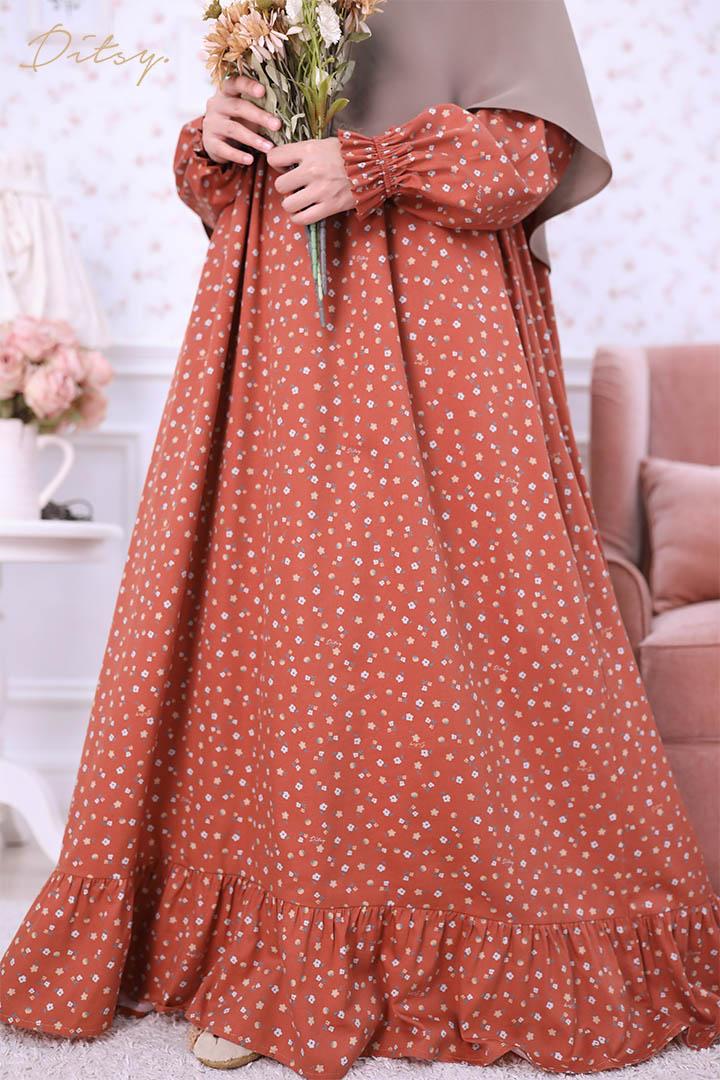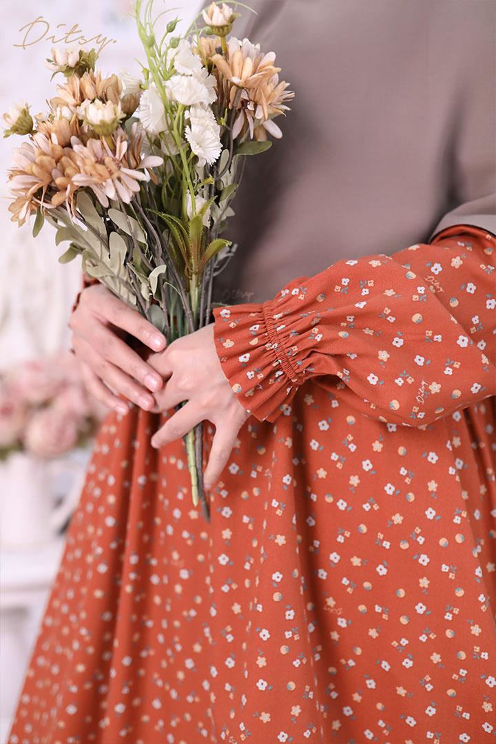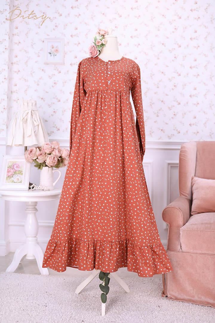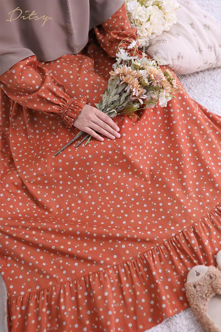 • Model Cicelle Red: Series 5, warna dasar merah keorangean (orange dusty). Ada ruffle bagian bawah menambah cantik daster ini
