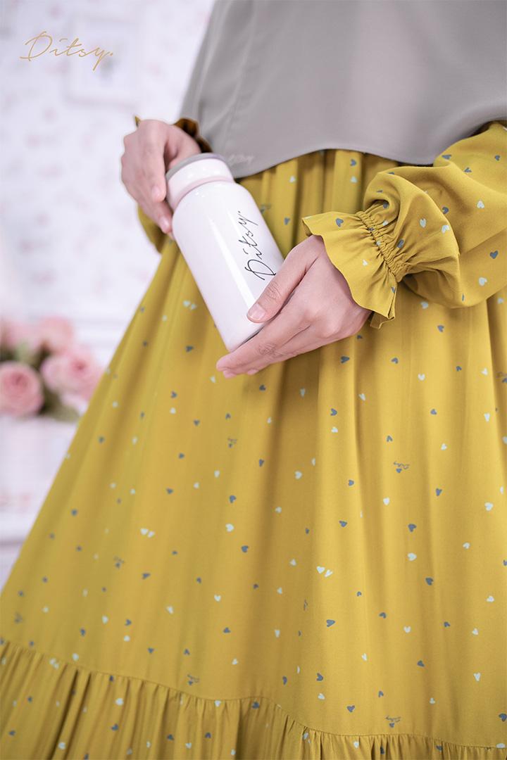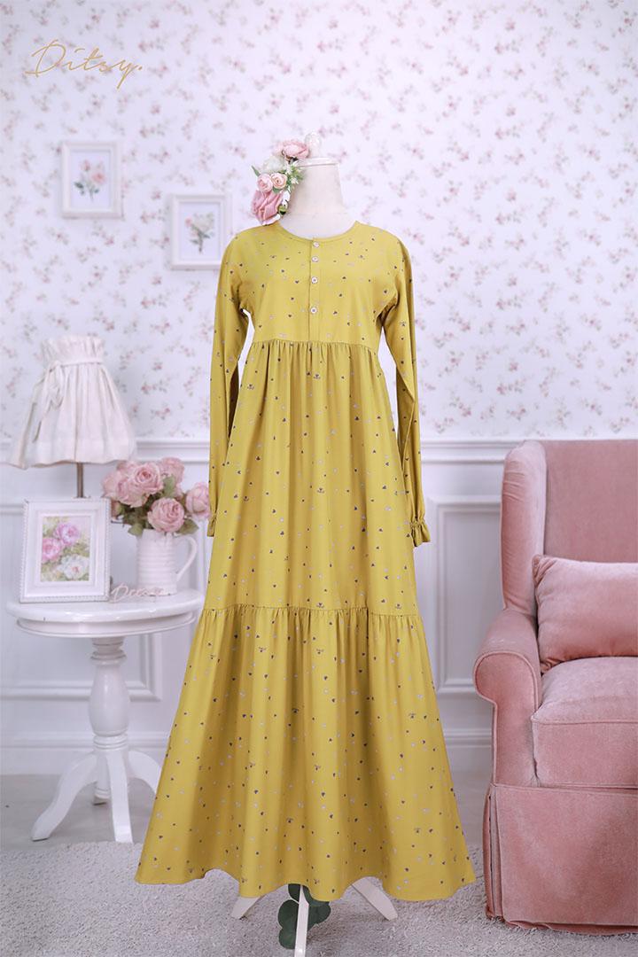 • Model Chava Citrine Yellow: Series 3, warna dasar kuning. Ada rempel didepan dan belakang bagian perut dan lutut yg membuat daster ini lebih slim namun tetap leluasa