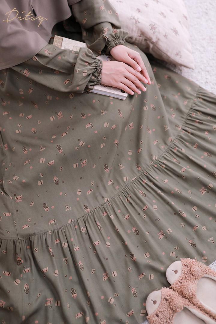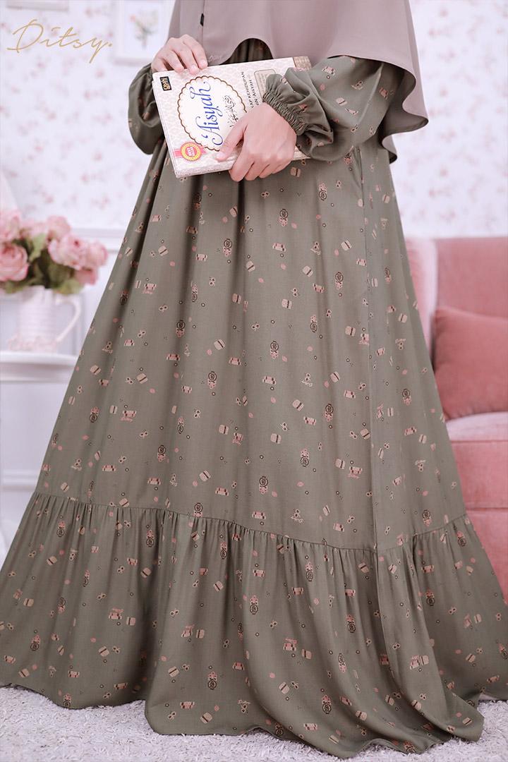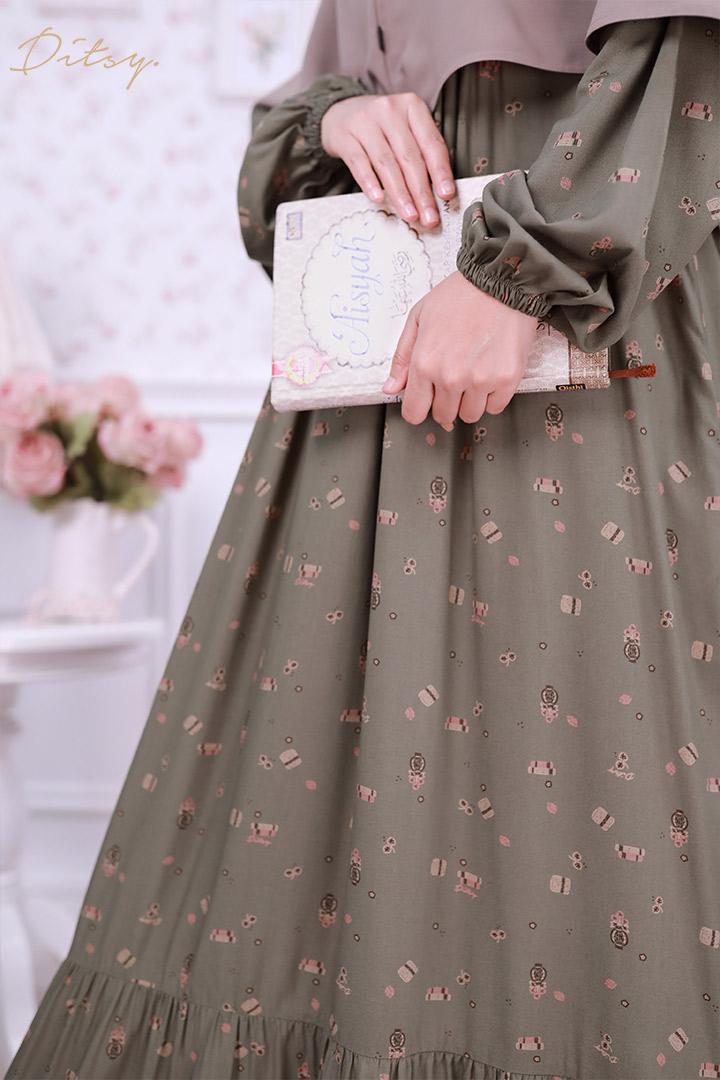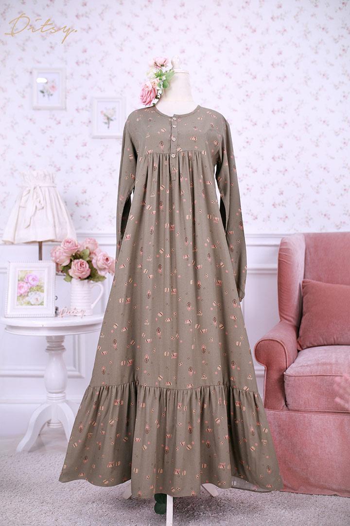 • Model Cady Sage : Series 7, warna dasar hijau ada hint abu. Ada rempel dibagian dada dan belakang namun tidak sekeliling sehingga membuat daster ini lebih leluasa