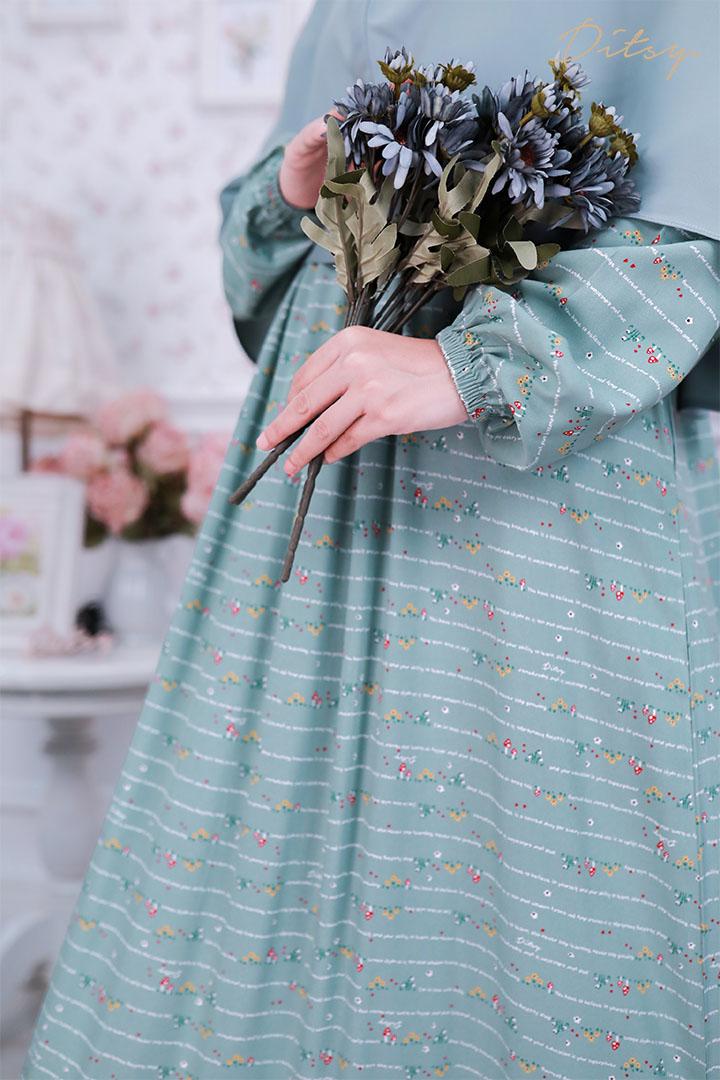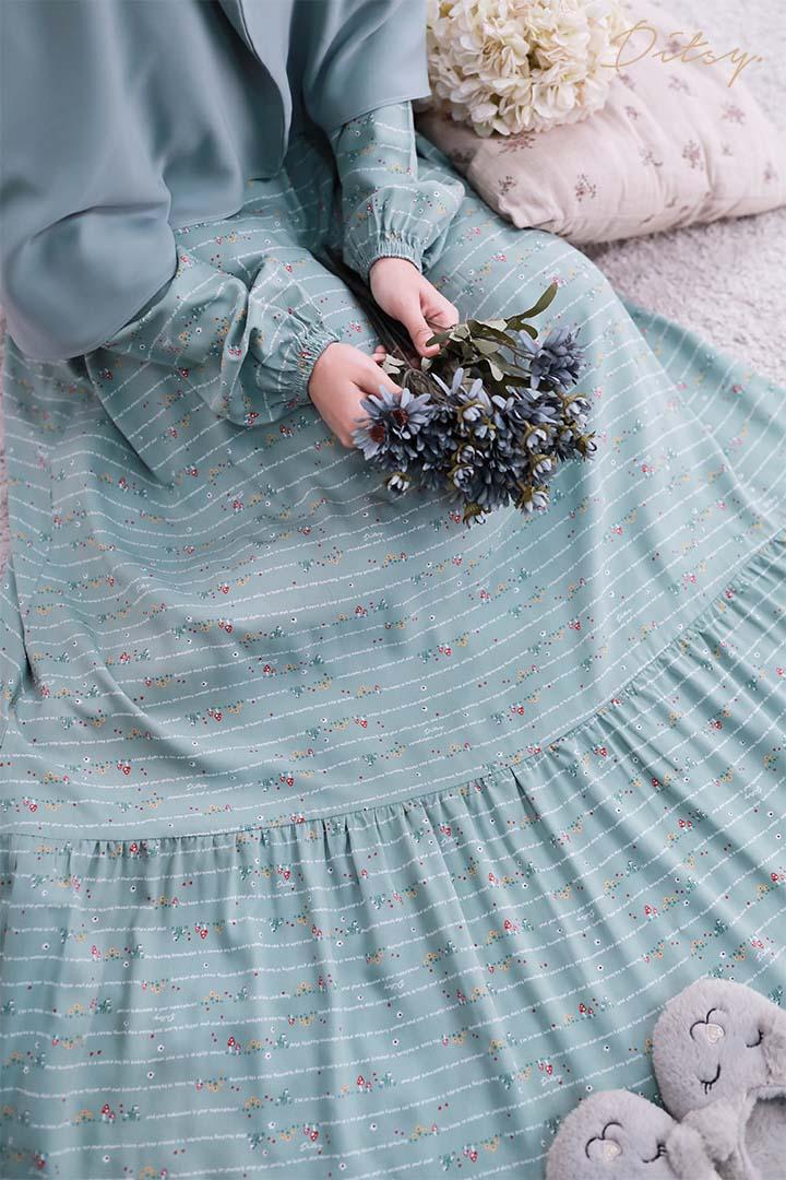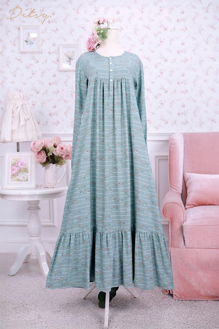 • Model Nienna Jade : Series 7, warna dasar hijau tosca muda. Ada rempel dibagian dada dan belakang namun tidak sekeliling sehingga membuat daster ini lebih leluasa